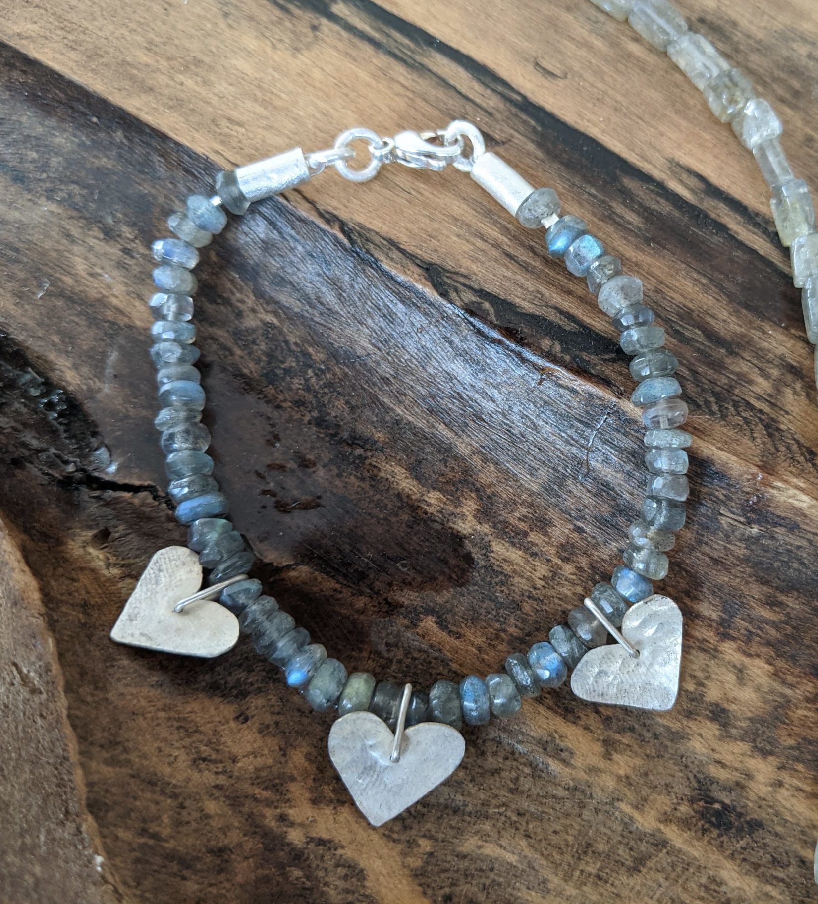 Das Armband besteht aus Labradorit und wird durch drei Herzen in 925er Silber ergänzt.