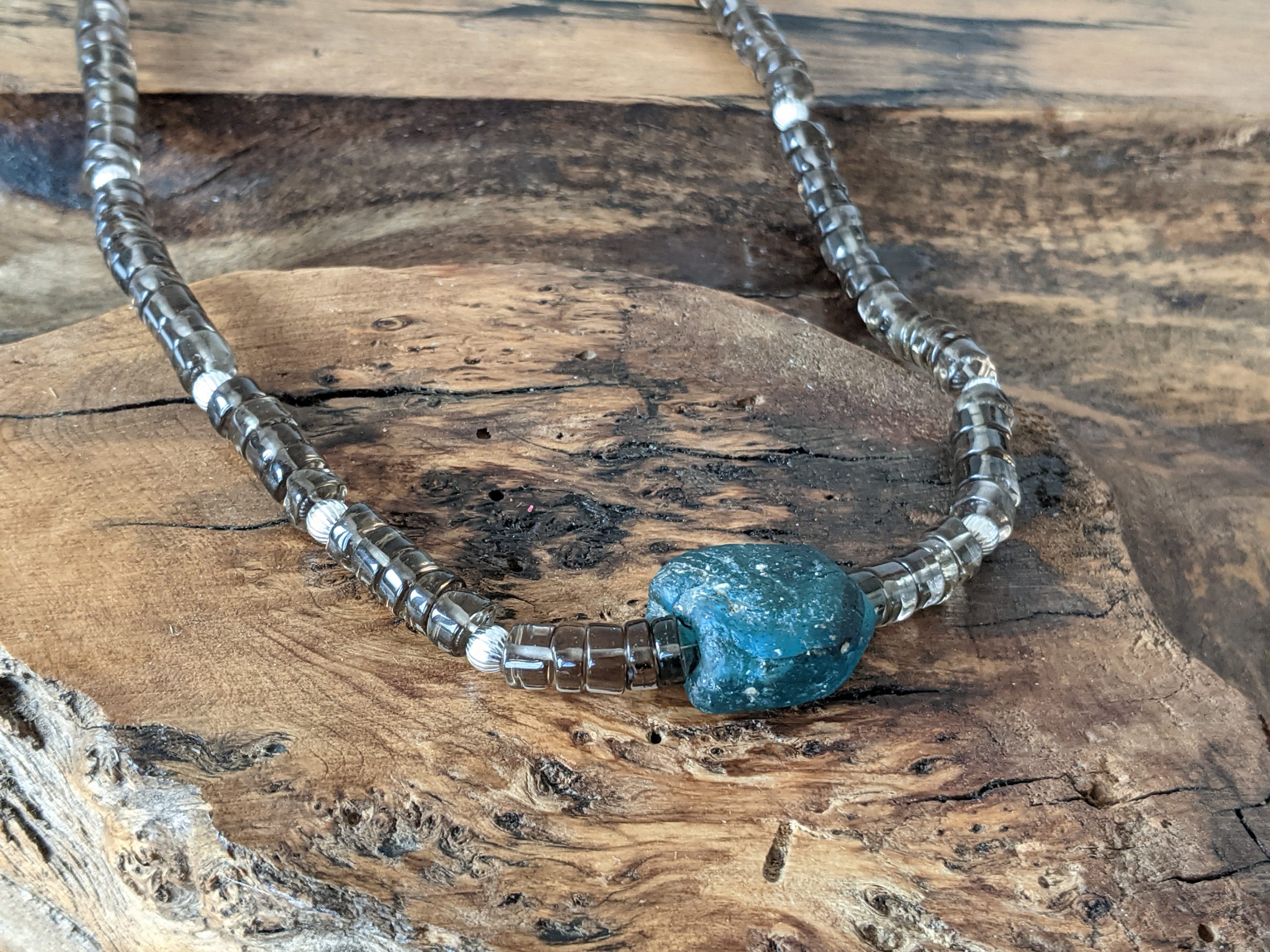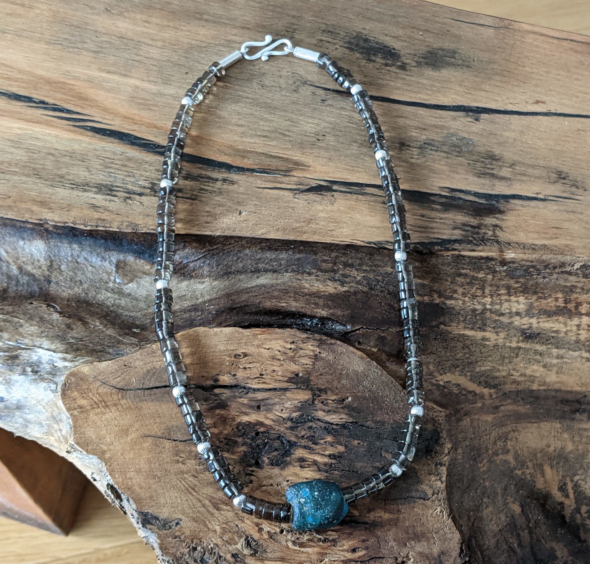 Kette mit Rauchquarz, Silber und Glas